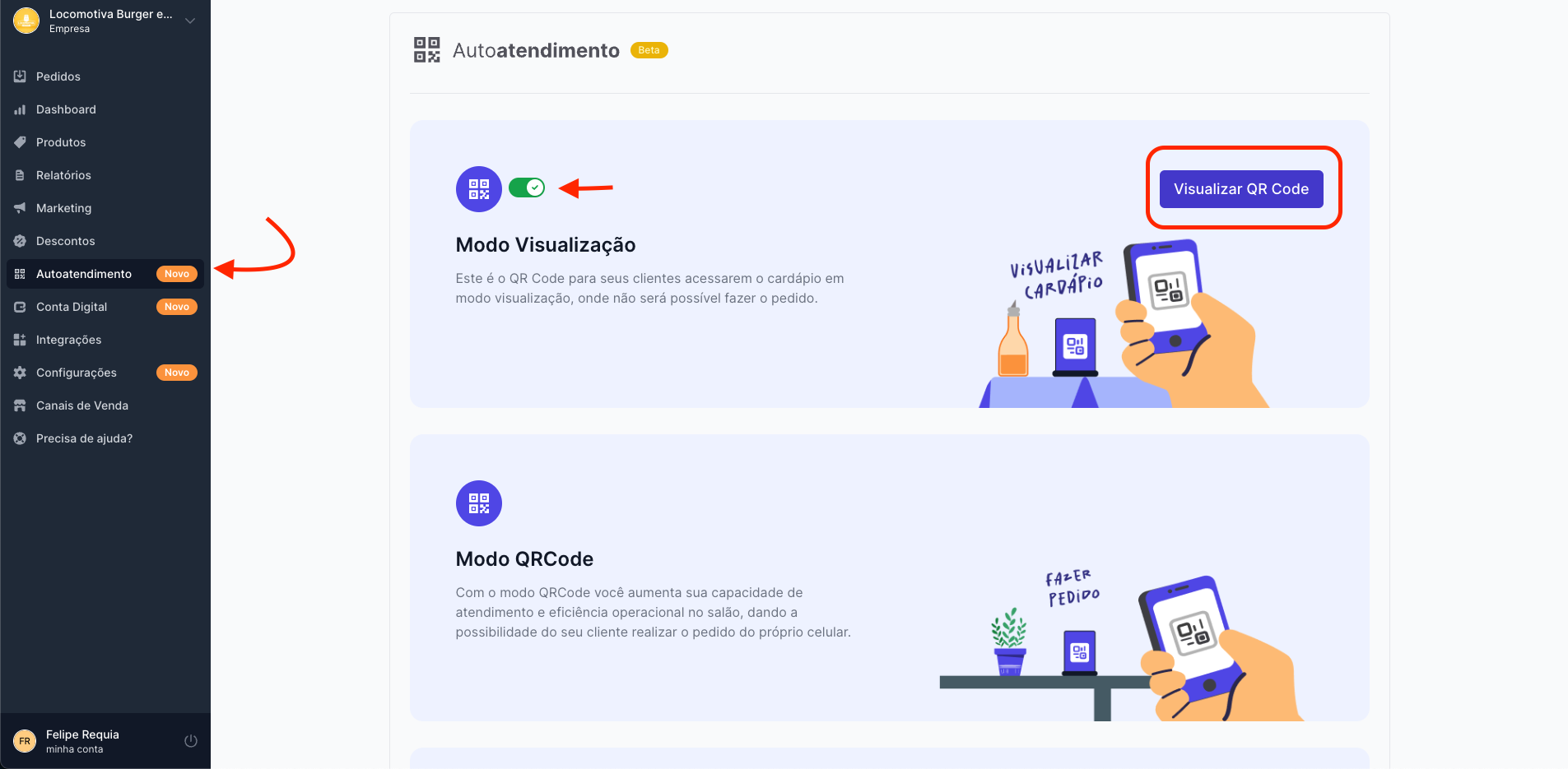 💡 **Lembre-se:** O **Modo Visualização** permite apenas que os clientes **vejam o cardápio**, sem a opção de realizar pedidos pelo QR Code
