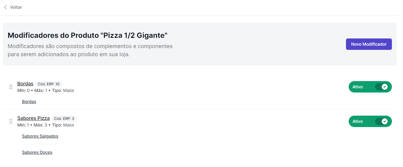 Os modificadores fazem o elo de ligação entre os Complementos e os Componentes. É nos modificadores que ficam as regras de negócio para formação de preço do produto.