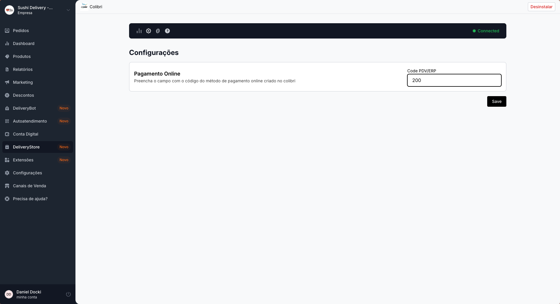Para configurar o código de pagamento online, acesse o aplicativo de integração com o Colibri no "DeliveryStore" do seu painel, acesse no meu acima as configurações e coloque o código do pagamento online configurado no Colibri.