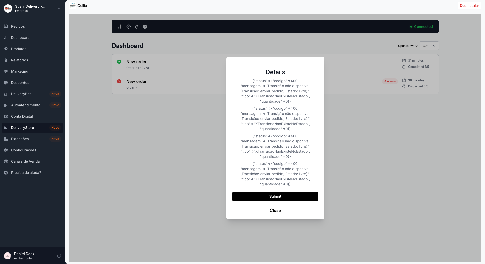 Erros no envio de pedidos podem ocorrer devido à falta de um código de integração no produto ou opção, ou mesmo por falhas de conexão com o Colibri. O sistema de integração com o Colibri tentará enviar o pedido até 5 vezes; após essas tentativas, ele não enviará mais automaticamente. Para reenviar manualmente, acesse o aplicativo de integração com o Colibri no **"DeliveryStore"** do seu painel, localize o pedido não enviado, clique nele e selecione **"Reenviar"**.