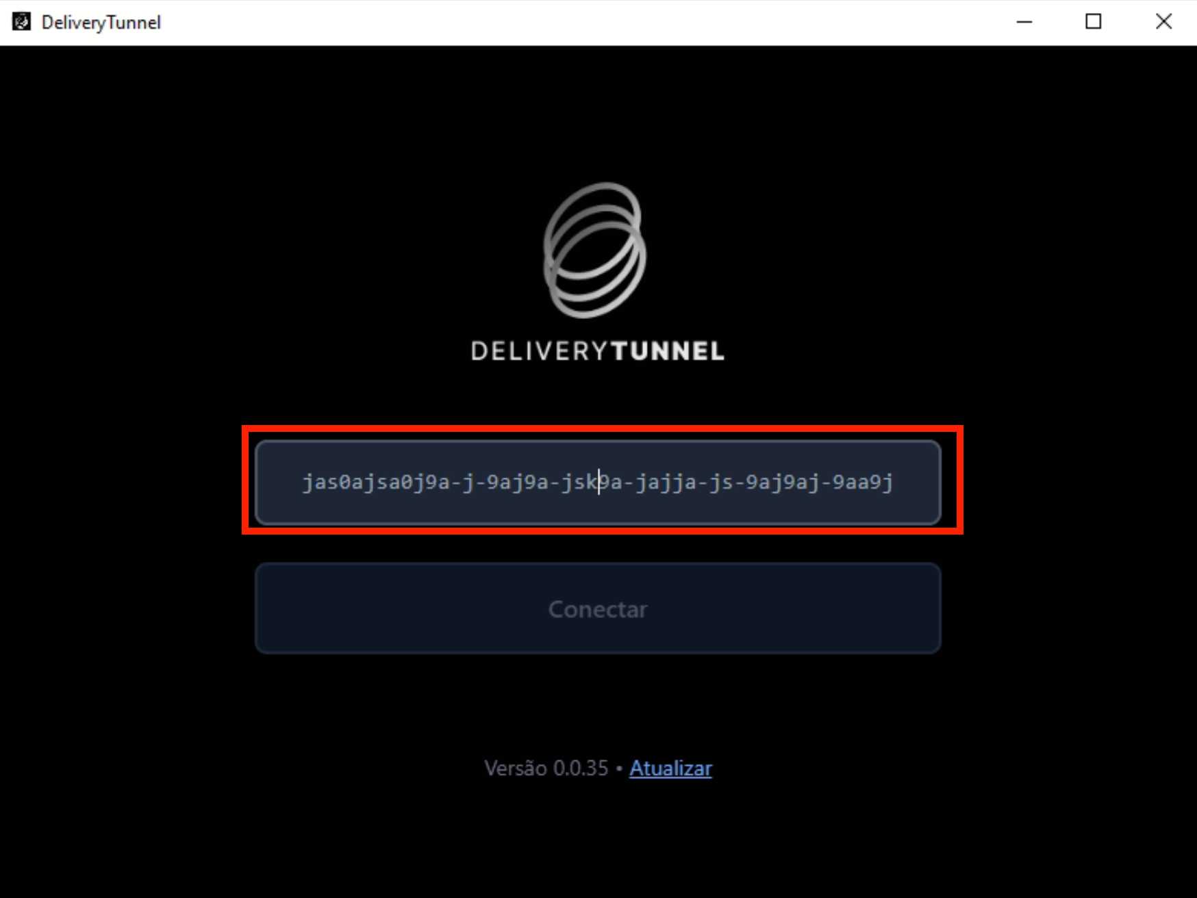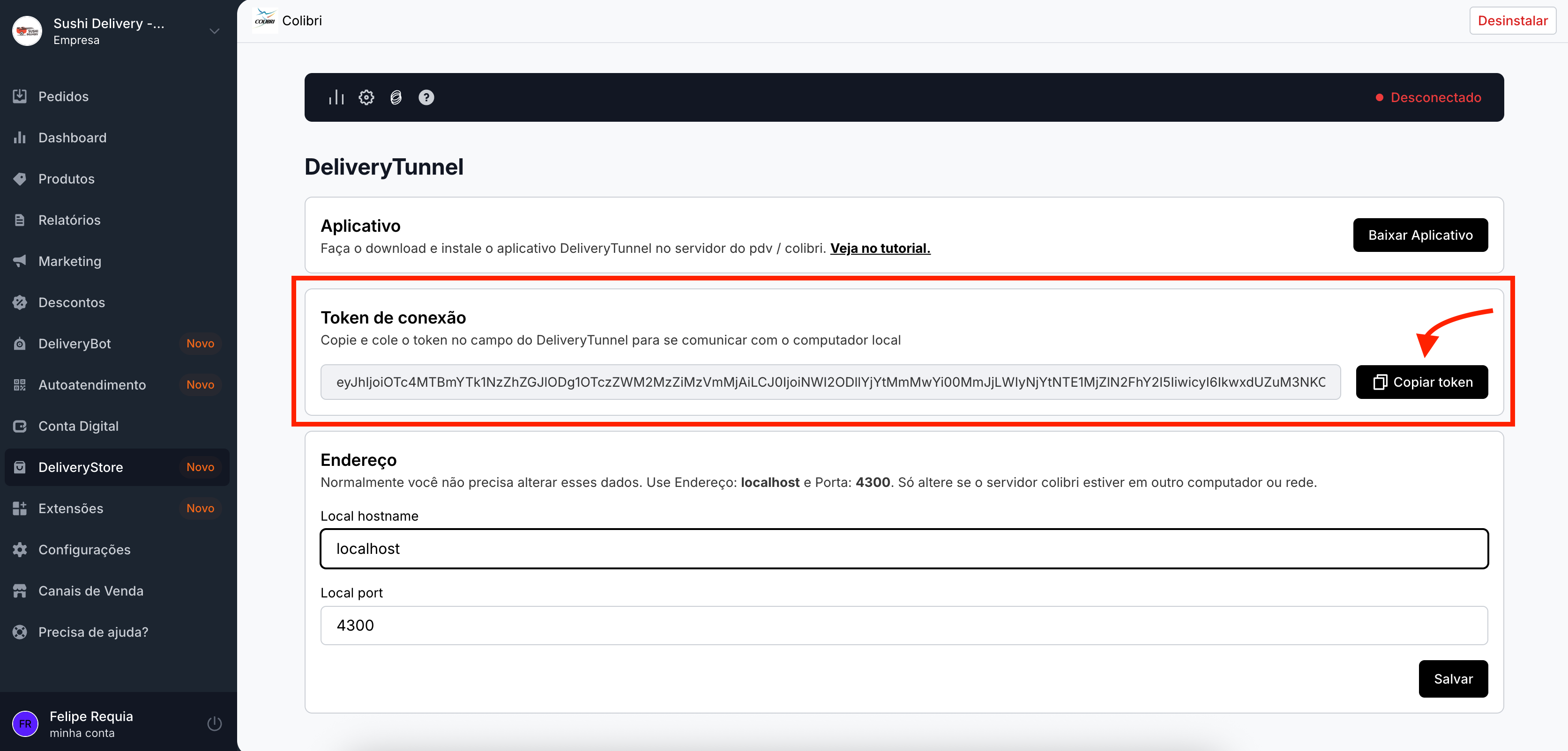 Ao clicar em salvar o sistema irá gerar um token de conexão do DeliveryTunnel com o gestor de pedidos, copie esse token de conexão e cole no campo do aplicativo DeliveryTunnel instalado no servidor colibri, como mostrado nas imagens abaixo.
