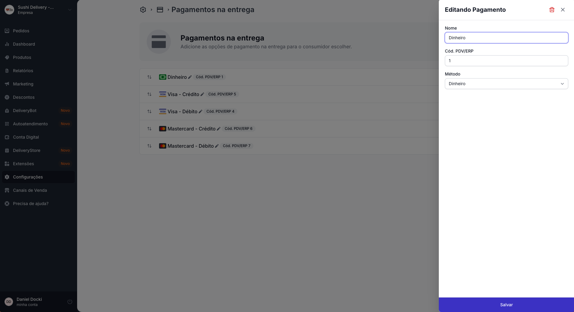 Para pagamentos na entrega, é necessário configurar os códigos externos nos meios de pagamento.