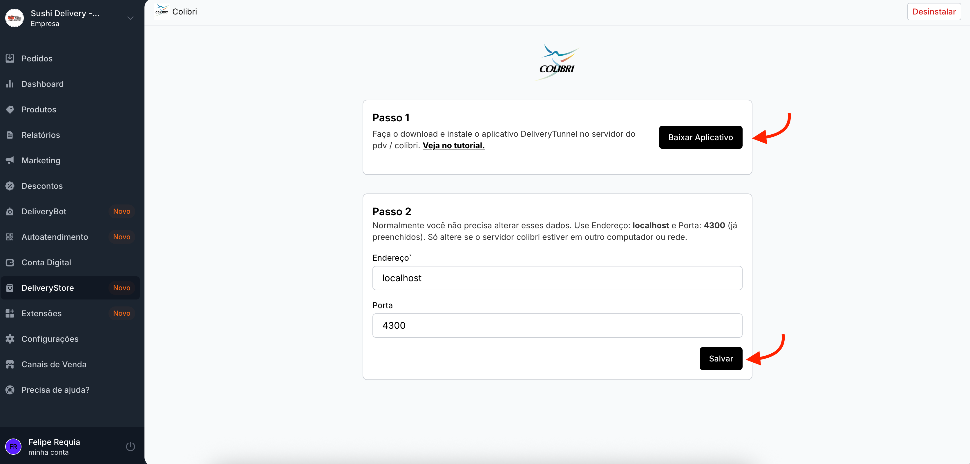 Depois de instalado o aplicativo de integração com o Colibri, você deve baixar o aplicativo **DeliveryTunnel** como mostrado na imagem abaixo e depois informar o endereço e a porta do servidor na rede clique no botão salvar, como mostrado na imagem abaixo.
