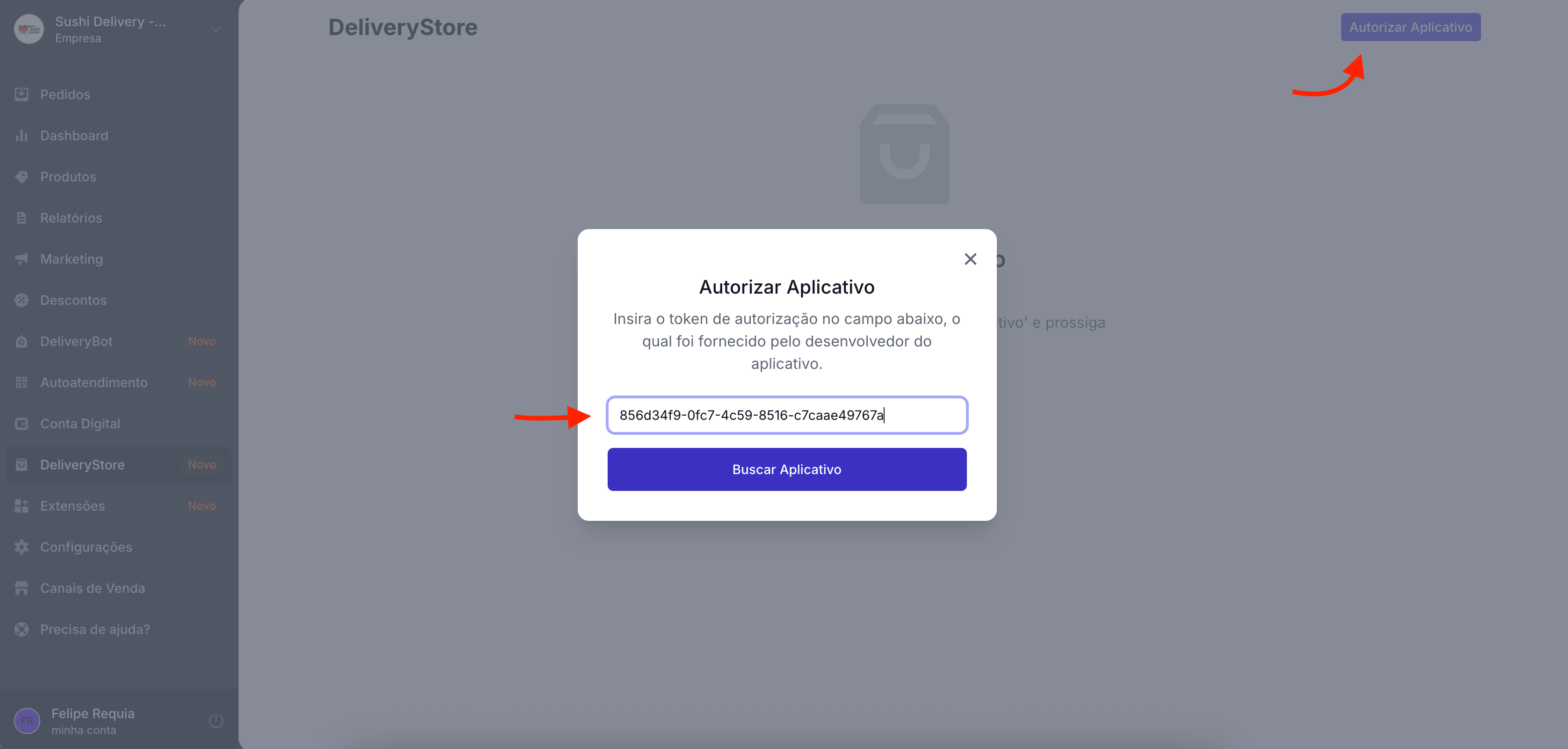 Em seu painel, acesso **DeliveryStore.** Você deve clicar em **"Autorizar Aplicativo"** e informar o seguinte token de acesso:
